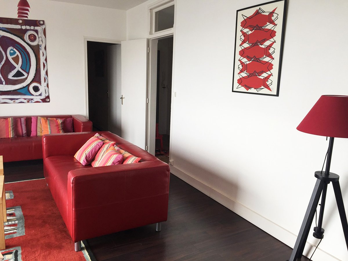 La décoration et l’ameublement de la pièce à vivre avec cuisine américaine jouent la carte de la tonicité en privilégiant le rouge.