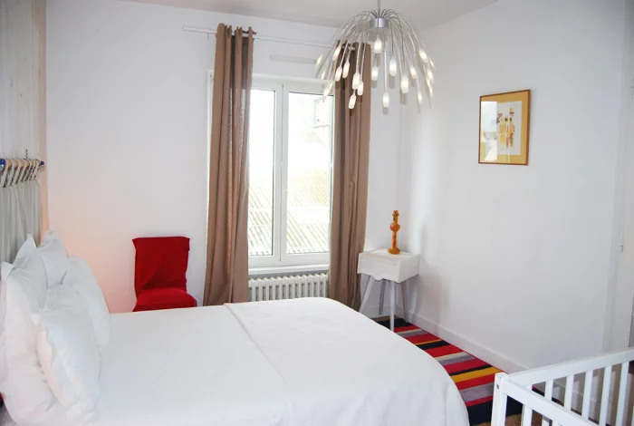 De la chambre côté mer (lit double 180 cm), on s’endort, bercé par le chant des vagues. Au Nord, une salle de bain (baignoire) avec wc (un 2ème wc indépendant dans le couloir) et deux autres chambres (1 lit double140. 2lits 90 pouvant être joints) pour une capacité d’hébergement de 6 personnes maximum.